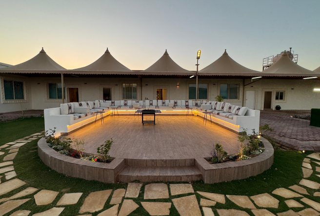 The ideal destination for hosting your events. A large football field for your sports events and gatherings. A modern Majlis-style tent for events, accommodating more than 100 people. A spacious dining Majlis that can accommodate more than 50 people. Contemporary outdoor seating overlooking green spaces. A fully equipped kitchen and space for outdoor reception seating.